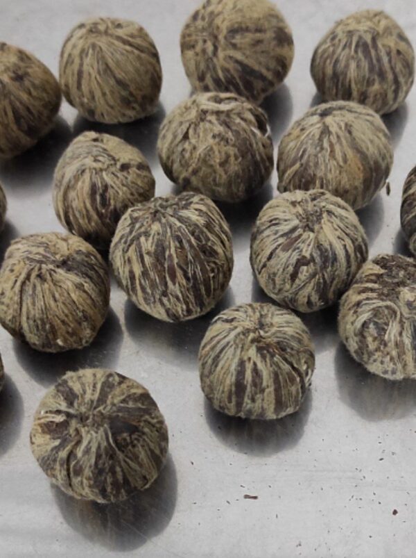 Цветы белого жасмина и молодые чайные почки, покрытые серебристым пушком, аккуратно собраны и скрученыв виде большого шара. При заваривании жасминовый шарраскрывается и чайный напиток приобретает свежий жасминовый аромат и и легкий сладковатый вкус.