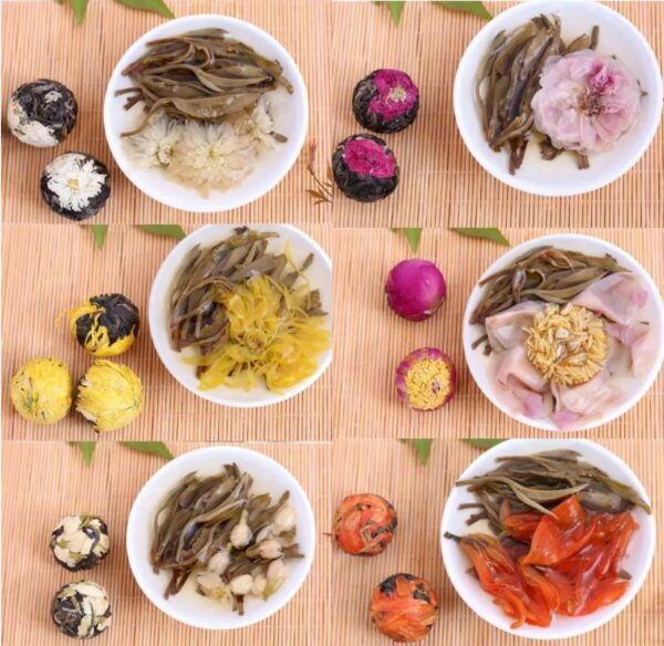 Шен Пуэр (Зеленый Пуэр) — изготовлен из пуэра Yunnan Sheng Puer c лепестками (цветками) лилии, хризантемы, календулы, розы, пиона, жасмина, скрученный в шар.